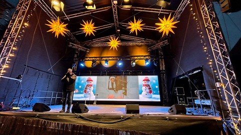 Wie aus dem Winterhimmel herab erscheint sie auf der großen Leinwand der Schlossweihnachtsbühne und spricht zu Kindern und Erwachsenen gleichermaßen.