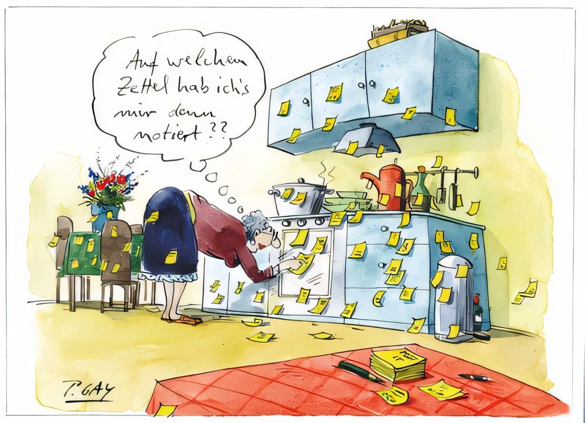 Auf menschenfreundliche und humorvolle Art greift der Cartoonist Peter Gaymann Lebenssituation aus dem Leben mit Demenz auf und nähert sich dem Thema auch mit einem Augenzwinkern. Er zeigt mit seinen Zeichnungen eindrücklich und nachfühlbar, welche Anstrengungen und Herausforderungen es kostet, sich in einem Leben mit Demenz zurechtzufinden und wie wichtig ein aufmerksames und unterstützendes Umfeld ist.
